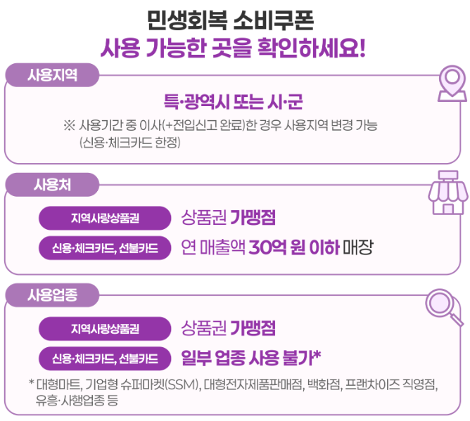 소비쿠폰은 지역 소상공인을 지원하는 정책이기 때문에, 대형마트나 백화점에서는 사용할 수 없어요. 반면 동네 마트, 전통시장, 소규모 프랜차이즈 가맹점(매출 30억 원 이하의 편의점 등)에서는 사용이 가능합니다.