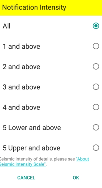 지진 발생 시에는 팝업 알림 형태로 지진의 강도와 발생 지역이 화면에 표시됩니다. 단, 일본 내에서 발생한 지진도 알림이 오기 때문에 너무 잦은 알림이 불편하게 느껴질 수 있어요. 이럴 경우에는 알람 강도나 지역 범위를 조절해보는 것도 방법입니다.