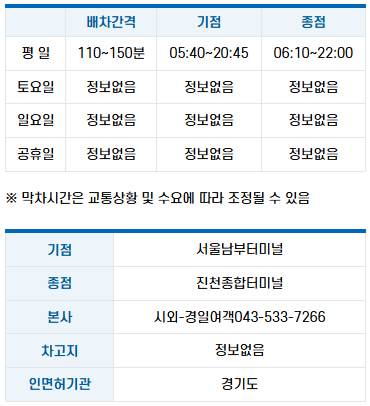 서울남부터미널 기준 첫차는 오전 6시 10분에 출발하며, 막차는 오후 9시 30분에서 9시 35분 사이에 배차된다. 진천종합터미널 출발 첫차는 오전 5시 20분, 막차는 오후 8시 45분이다. 평일과 주말 모두 유사한 운행 간격을 유지하지만, 금요일 저녁과 일요일 오후에는 수요 증가로 좌석이 조기 매진되는 경우가 있다.