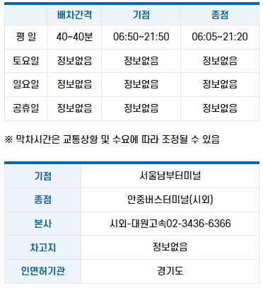 8131번 버스의 운행 시간은 출발지에 따라 조금 달라져요. 서울남부터미널에서 출발하는 버스는 평일과 주말 모두 오전 6시 20분부터 오후 8시 30분까지 운행하고 있어요. 반대로 안중버스터미널에서 출발하는 버스는 평일과 주말 모두 오전 6시부터 오후 8시 20분까지 운행된답니다. 서울남부터미널에서 안중터미널까지의 구간 소요 시간은 일반적으로 약 1시간 30분으로 예상되는데요. 하지만 신호 대기, 승하차 시간, 도로 상황에 따라 실제 소요 시간은 달라질 수 있으니 참고하는 게 좋아요. 요금은 안중터미널 기준으로 7300원이에요.