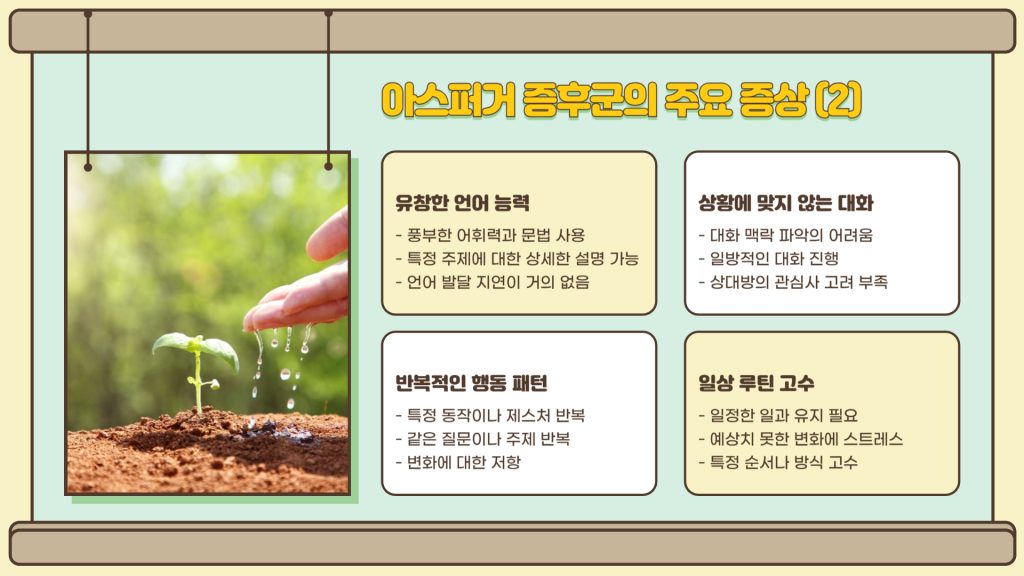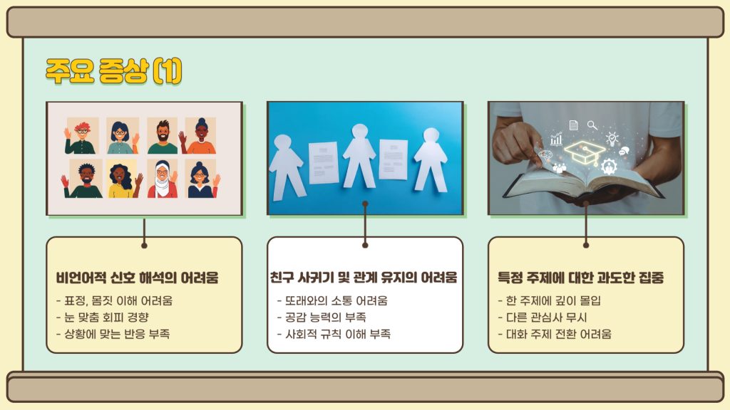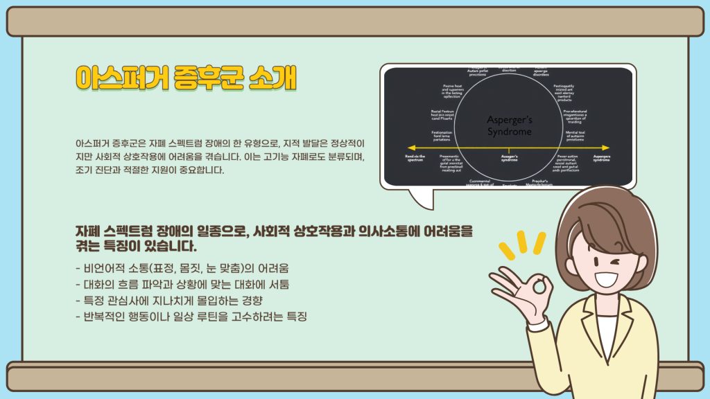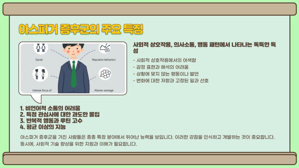 아스퍼거 증후군은 지적 발달에는 큰 문제가 없지만, 타인과의 관계에서 어색함을 보이거나 비언어적 소통에 어려움을 느끼는 것이 특징이에요. 예를 들어, 표정이나 몸짓, 눈 맞춤 등을 자연스럽게 사용하는 데 어려움이 있고, 대화의 흐름을 파악하는 데도 서툴 수 있습니다.