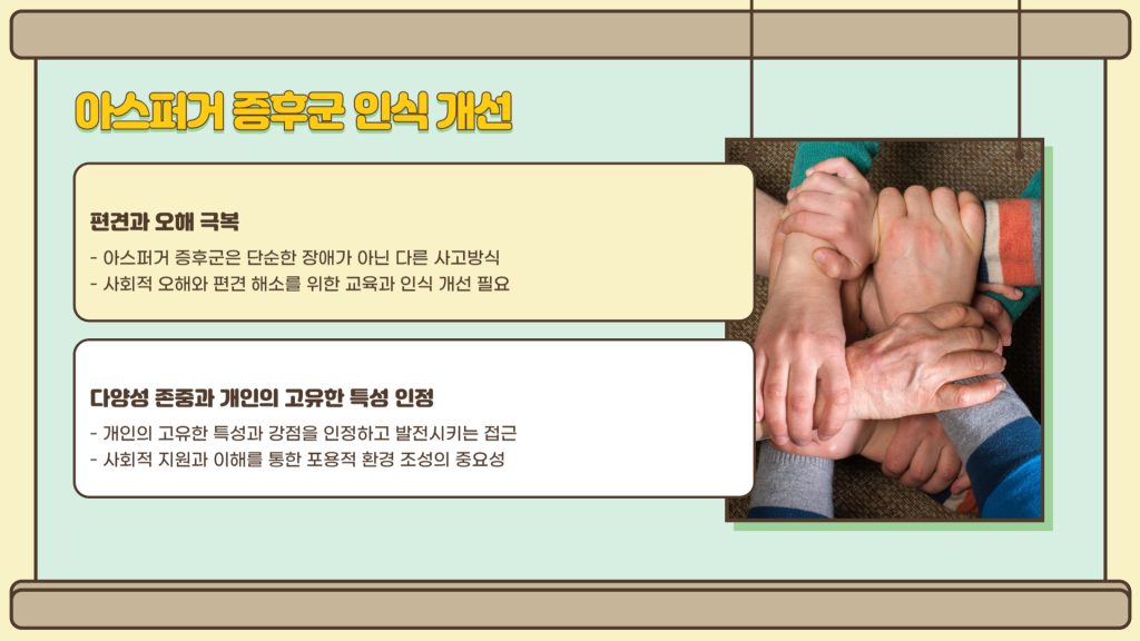 아직도 일부에서는 아스퍼거 증후군에 대해 오해하거나 편견을 갖고 바라보는 경우가 있습니다. 하지만 이는 단지 다른 방식의 사고와 소통 방식일 뿐이며, 그 속에 감정과 공감의 능력도 분명히 존재합니다.
