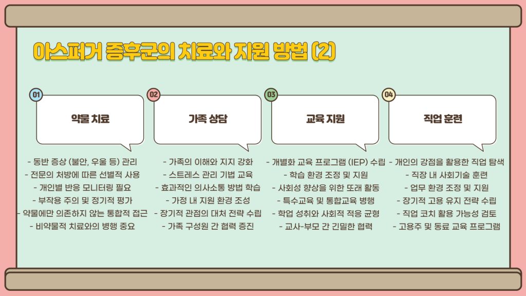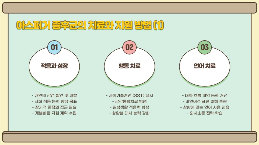 아스퍼거 증후군은 완치의 개념보다는 적응과 성장의 관점에서 접근해야 합니다. 다양한 치료법을 통해 일상생활에서 겪는 어려움을 줄이고, 강점을 발휘할 수 있도록 돕는 것이 핵심이에요.