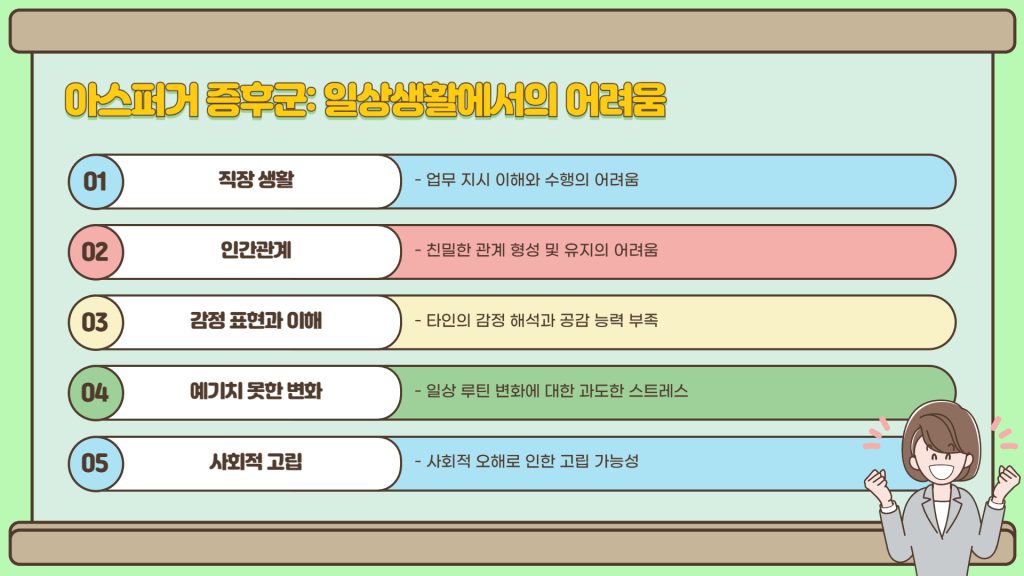 특히 성인이 된 후에는 직장, 인간관계, 연애 등 다양한 영역에서 어려움을 느낄 수 있습니다. 예기치 못한 상황 변화에 대한 적응이 어렵거나, 미묘한 감정 표현을 해석하지 못해 오해를 받는 경우도 많습니다.