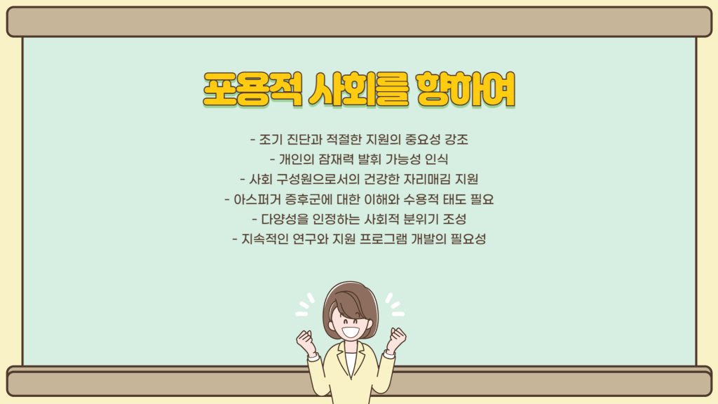 아스퍼거 증후군은 단순한 진단명이 아닌, 각 개인이 가진 독특한 특성과 삶의 방식에 대한 이해로 이어져야 합니다. 빠른 진단과 적절한 지원을 통해 충분히 안정적이고 만족스러운 삶을 살아갈 수 있습니다. 주변의 따뜻한 시선과 지원이 모일 때, 더 많은 이들이 사회의 구성원으로 건강하게 자리 잡을 수 있을 거예요.