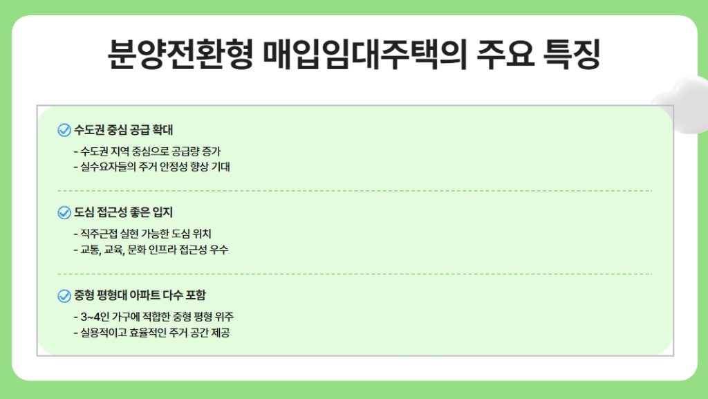 이 중 분양전환형 매입임대주택은 수도권 중심으로 공급이 확대되며, 도심 접근성 좋은 입지에 중형 평형대 아파트가 다수 포함되어 있어 더욱 인기가 높을 것으로 예상됩니다.