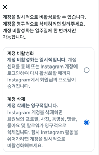 모든 사진, 영상, 팔로워 정보 등이 사라진다는 내용인 거죠. 떠나는 이유를 묻는 설문 페이지는 서비스 개선을 위한 자료일 뿐이거든요.