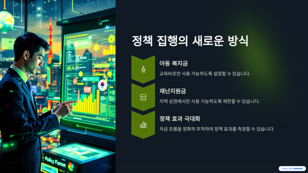 이러한 프로그래머블 구조는 정부가 정책 자금을 정밀하게 집행할 수 있는 강력한 수단이 됩니다. 예를 들어 아동 복지금은 교육비로만, 재난지원금은 지역 상권에서만 사용 가능하도록 설정할 수 있어 정책 효과를 극대화할 수 있습니다.