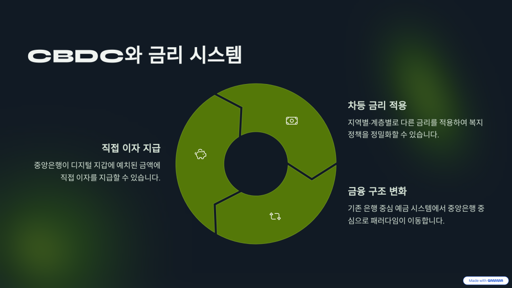 CBDC가 상용화될 경우, 중앙은행이 디지털 지갑에 예치된 금액에 대해 직접 이자를 지급하는 방식도 현실화될 수 있습니다. 이는 기존의 은행 중심 예금 시스템과 크게 다른 방식으로, 금융 시장에 구조적 변화를 가져올 수 있습니다.