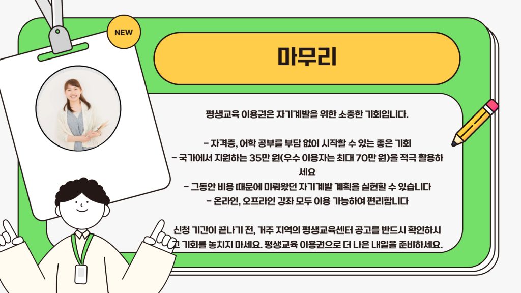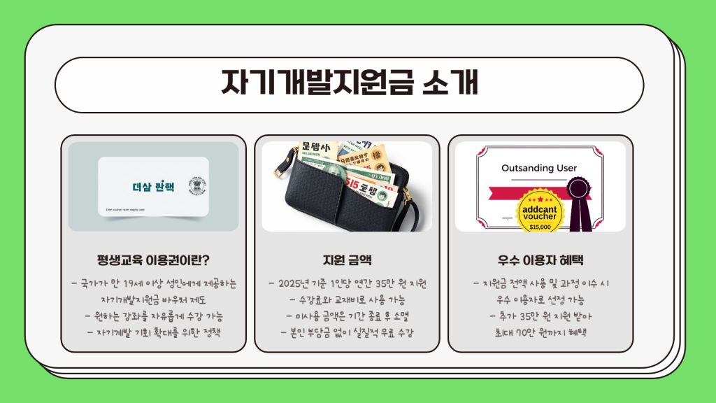 어학 강의나 자격증 공부를 하고 싶은데, 비용 때문에 망설였던 적 있으신가요? 이제는 개인 부담 없이, 나라에서 주는 자기개발지원금으로 해결할 수 있어요. 바로 ‘평생교육 이용권’이라는 제도를 활용하면 되는데요, 2025년 기준으로 1인당 최대 35만 원이 지원된다고 합니다. 오늘은 이 제도에 대해 아주 쉽게, 신청 방법까지 한눈에 정리해드릴게요.