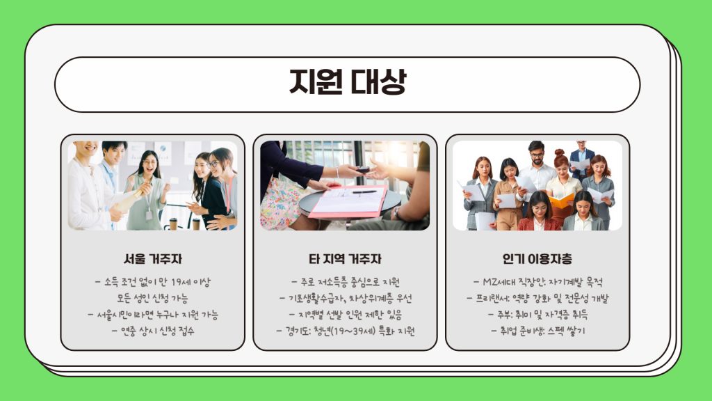 지원 대상은 지역별로 조금씩 다르지만, 서울의 경우 소득 조건 없이 모든 성인이 신청 가능하고, 다른 지역은 주로 저소득층 중심입니다. 특히 MZ세대 직장인, 프리랜서, 주부들 사이에서 인기가 높다고 해요.