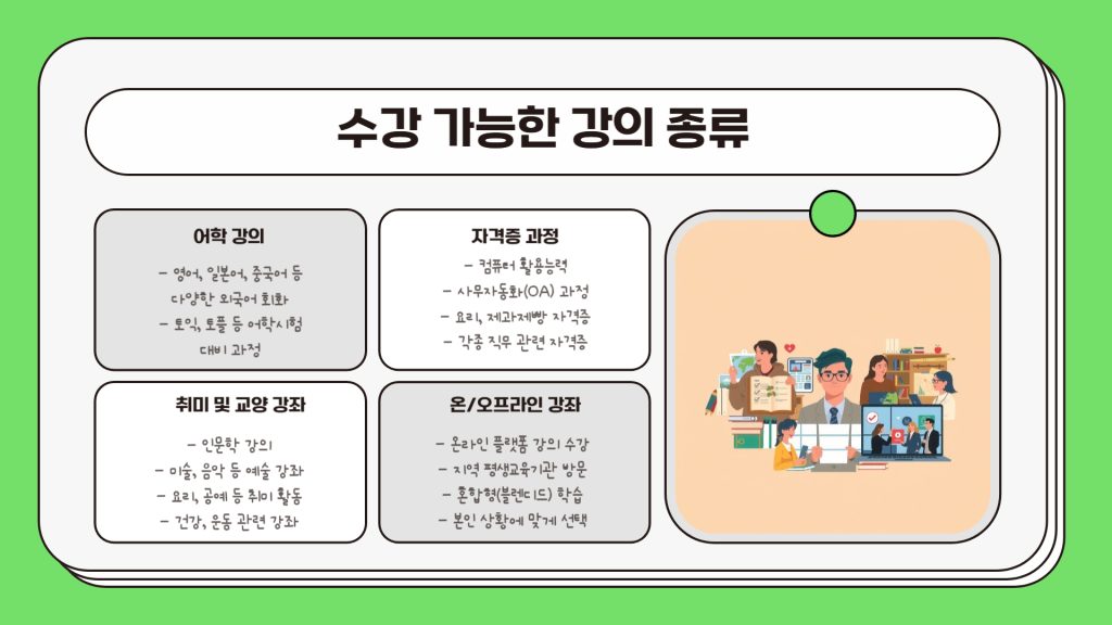지원금으로 수강할 수 있는 강좌는 정말 다양합니다. 어학, 자격증, 취미, 교양, 인문학 강의 등 대부분의 평생교육기관 강좌가 가능해요. 온라인, 오프라인 모두 가능하고 본인 부담금도 없기 때문에 실질적으로 무료로 수강이 가능합니다.