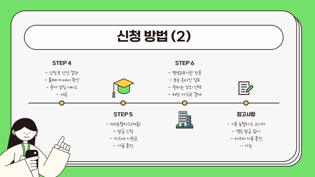 카드를 이미 가지고 있다면 별도 발급 없이 바로 바우처가 충전되며, 신규 신청자는 농협 영업점이나 홈페이지에서 ‘평생교육 바우처 카드’를 발급받아야 합니다.