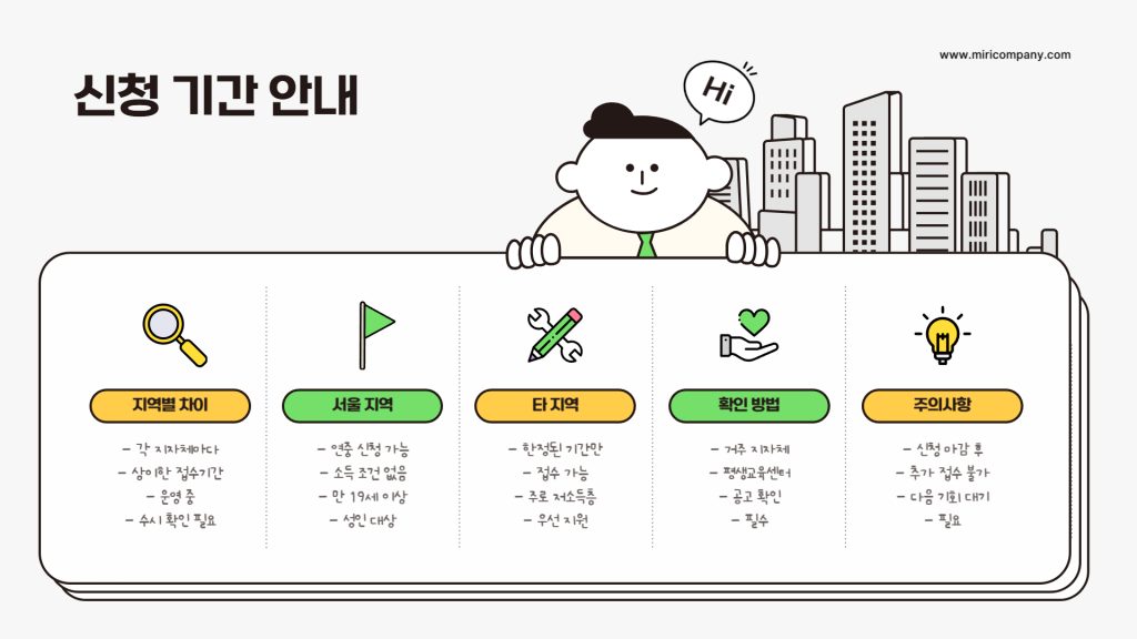 서울의 경우는 연중 신청 가능하지만, 타 지역은 한정된 기간만 접수받는 경우가 많습니다.